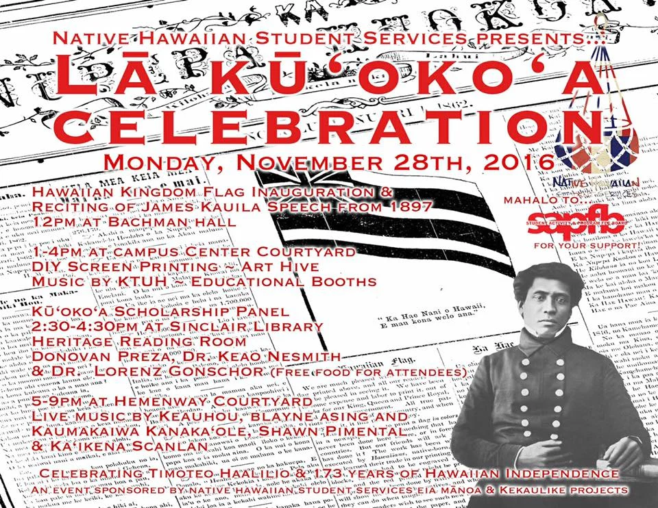 Join Native Hawaiian Student Services for their 2nd Annual Lā Kū'oko'a (Hawaiian Independence Day) Celebration happening this Monday, November 28th at the University of Hawai'i at Mānoa.