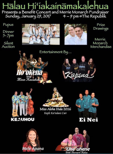 Aloha nui kakou! We will be at the Republik supporting Halau Hiiakainamakalehua as they prepare to head off, once again, to the Merrie Monarch festival. We will be playing from 5:00-6:00pm.